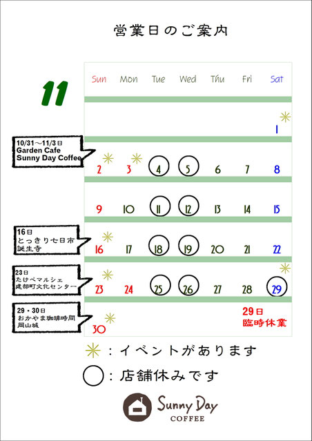 11月の営業日とイベント予定をお知らせします。 29日は「おかやま珈琲時間」へ参加の為、誠に勝手ながら臨時休業とさせていただきます。